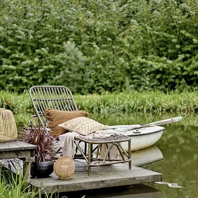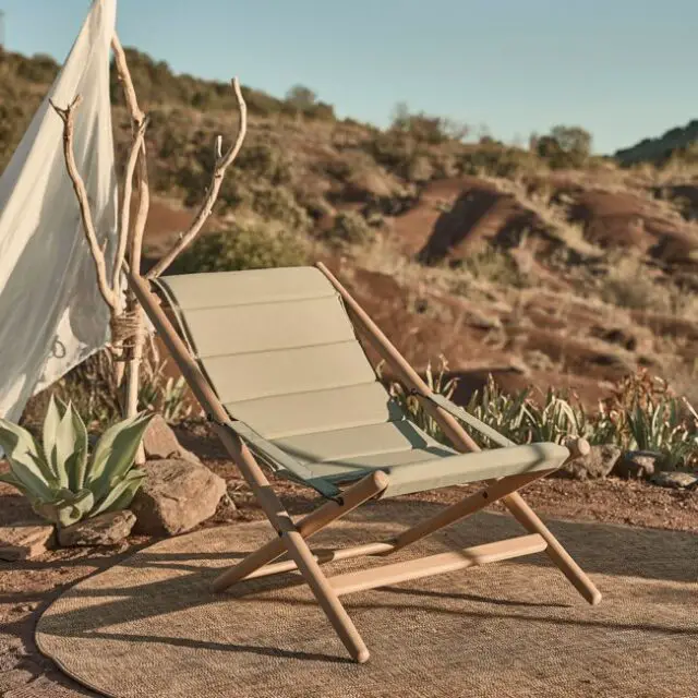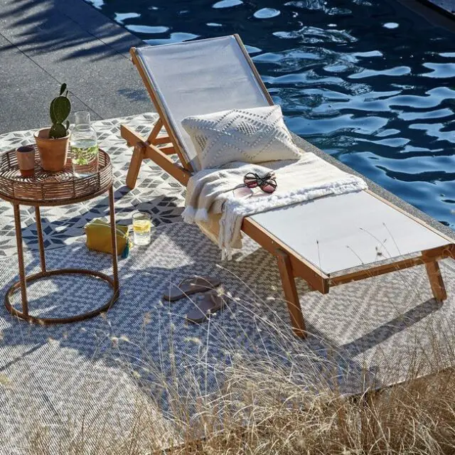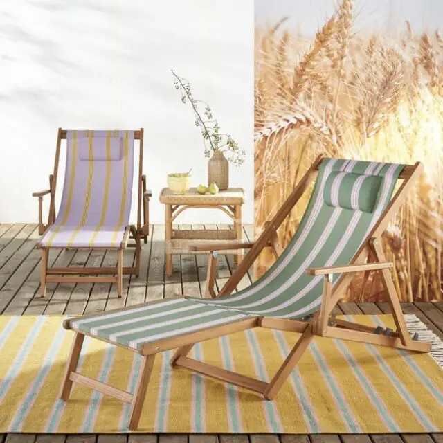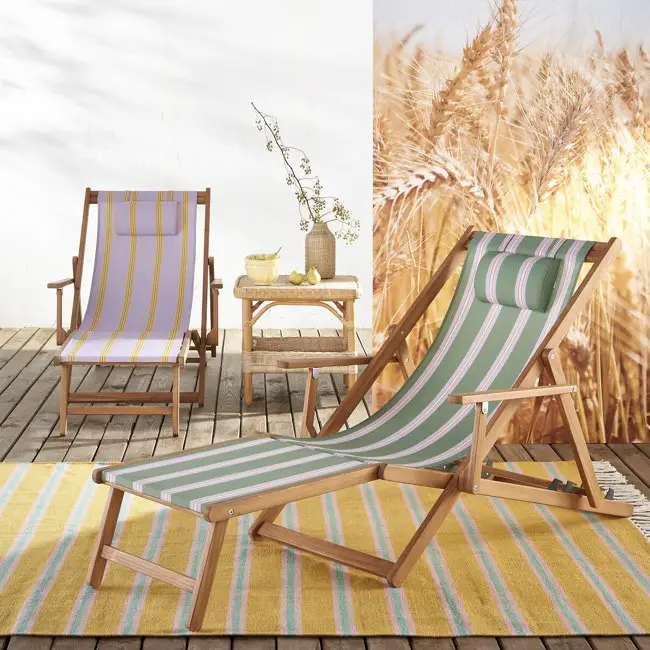 Niveau déco, ce qui me plait, c'est que la chilienne, comme le transat me rappellent mon enfance. Les chaises que l'on sortait de la remise dès qu'il y avait du soleil, celles qu'on transportait à la plage. Une toile colorée, qui sèche facilement. Et l'armature en bois est toujours d'actualité pour une déco naturelle même en extérieur.