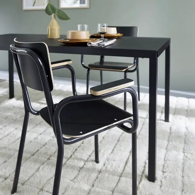 Si vous optez pour des fauteuils, il est indispensable de vérifier si les accoudoirs passent sous le plateau de la table.