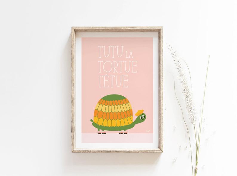 Le côté éveil et imaginaire me plait beaucoup dans la chambre des enfants. (Et je crois que cela manque cruellement aux adultes malheureusement). J'aime la capacité des gamins à monter des histoires un peu improbables, j'aime aussi quand ils sont en demande d'histoire féériques, de personnages un peu loufoques pour mieux appréhender le monde qui les entoure. Et puis cette tortue têtue... Ca me parle bien! (Et j'assume partiellement le fait d'être têtue. L'affiche aurait pu s'appeler: "Juju, la tortue têtue"!)