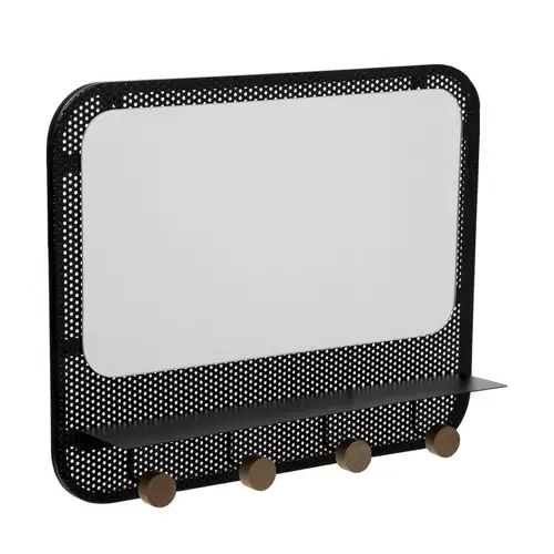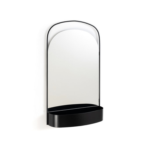 Moins fréquent et pourtant très pratique dans le cas d'un petit couloir d'entrée, l'étagère. Elle permet de déposer les petits objets du quotidien sans pour autant encombrer le passage ou l'espace au sol. Sous l'étagère on peut imaginer avoir un porte parapluie, une petite étagère pour les chaussures ou le sac à man... Bref, l'étagère est intéressante aussi parce qu'elle est moins profonde qu'un meuble classique utilisé dans l'entrée. Un miroir au dessus de l'étagère aura la même sens que dans la configuration précédente. En revanche, il faut respecter l'idée de légèreté induite par l'étagère. On prendra donc un miroir épuré pour cette disposition, plutôt qu'un miroir avec un encadrement travaillé et donc plus lourd visuellement.
