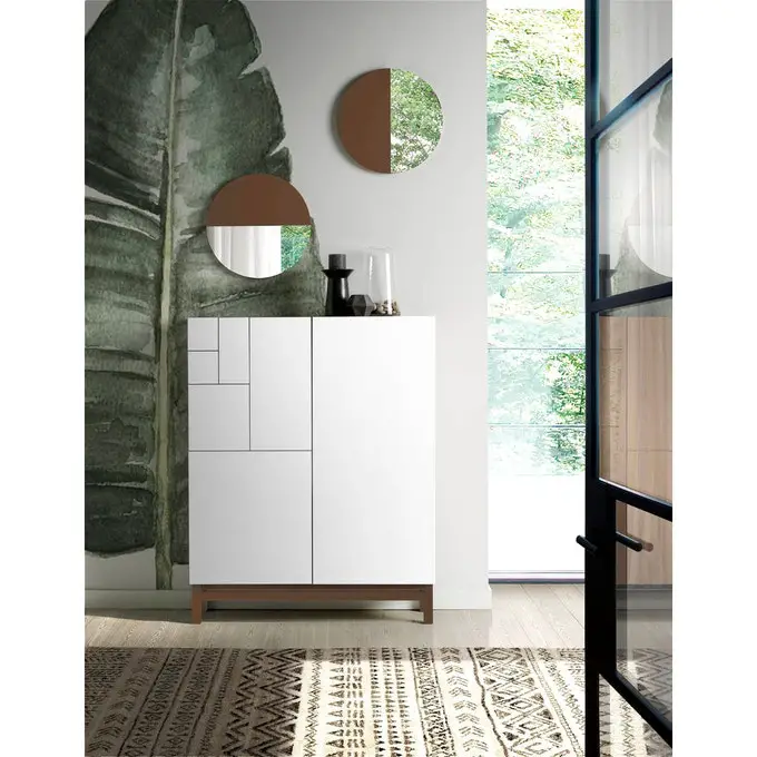 Dans un autre registre, on peut trouver dans l'entrée un petit buffet. Ce qui est intéressant avec ce type de meubles c'est qu'il permet de ranger des choses qui n'ont pas de place ailleurs dans la maison. On peut penser par exemple aux papiers importants du foyer; au lieu de les ranger dans la salle à manger ou dans le salon, ils trouvent leur place dans l'entrée. Pour meubler votre entrée avec un buffet, il est essentiel qu'il soit adapté à votre espace, ni trop petit, ni trop grand. Prévoyez de l'espace de chaque côté du meuble pour éviter l'effet de tassement. Et au dessus: miroir, cadres, lampes à poser ont une place de choix pour décorer votre pièce.