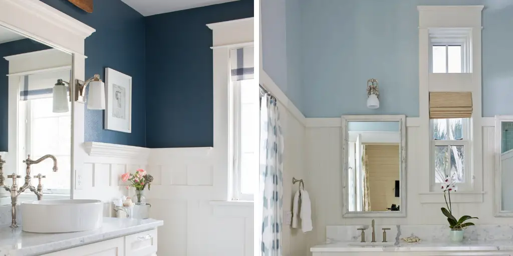 Enfin, vous pouvez imaginer aussi un duo de carrelage, bleu et blanc. Pratique pour créer des lignes, motif fréquemment retrouvé dans les ambiances beach house. On peut aussi délimiter les espaces avec du carrelage de couleur bleu en opposition avec du carrelage blanc, dans la même veine que ce que j'ai évoqué plus haut avec le carrelage écaille. Pour éviter de tomber dans le cliché, n'oubliez pas d'apporter une touche plus naturelle avec du bois par exemple. Cela donnera à votre salle de bain une allure plus authentique et raffinée.