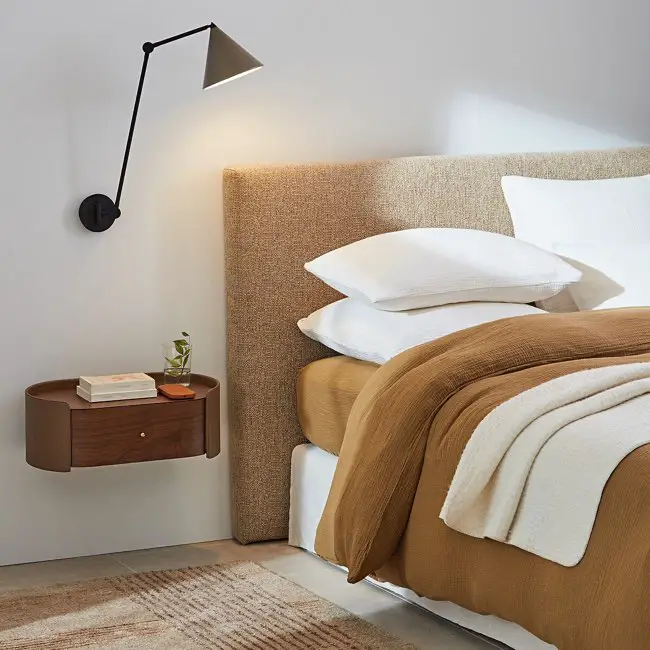 Une table de chevet murale peu encombrante est une excellente option pour maximiser l’espace dans votre chambre, notamment à côté de votre lit. L'absence de piètement lui offre un design plus aérien et plus léger qu'une table de nuit classique. C'est une bonne alternative pour ne pas perdre de place tout en ayant un appoint de rangement aux abords du lit. Je vous propose ici des conseils pour bien choisir votre nouvelle table de nuit murale ainsi qu'une sélection shopping pour vous aider à meubler facilement votre petite pièce.