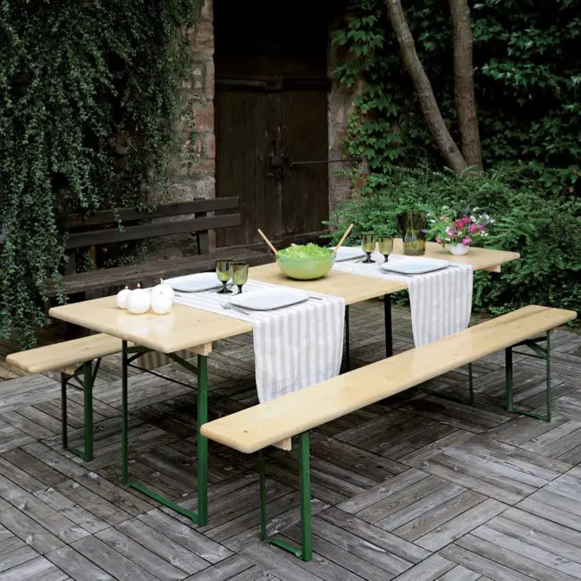 Ce qui me plait avec l'idée de la table de pique-nique c'est qu'elle fait partie du mobilier de jardin simple et naturel. Pas de chichis à outrance. La simplicité prime. Ca va de mise avec la balançoire en bois par exemple. Le pique-nique est une activité familiale, c'est donc idéal quand on a des enfants. J'imagine bien ce type de meuble extérieur à proximité d'un poulailler. Par ailleurs, ce qui me parle beaucoup avec ce type de meubles, c'est qu'il symbolise pas mal l'idée de durable. On s'attend à ce qu'il dure plus longtemps qu'un salon de jardin en plastique. La table de pique-nique classique est aussi plus intemporelle qu'une salle à manger de jardin contemporaine.