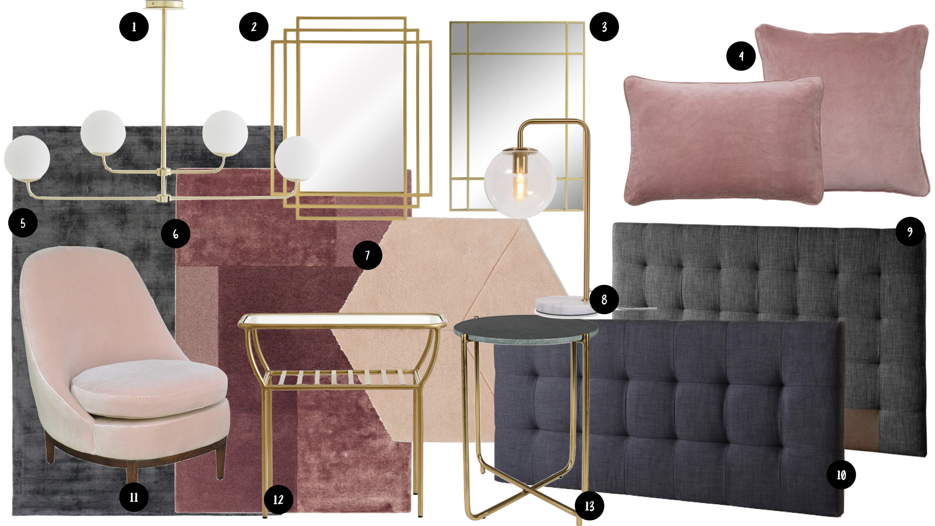1. suspension 2. miroir art déco 3. miroir 4. housses de coussin en velours 5. tapis gris 6. tapis rose poudré 7. tapis hexagonal 8. lampe à poser 9. tête de lit capitonnée (H100cm) 10. tête de lit capitonnée 11. fauteuil 12. guéridon laiton 13. guéridon laiton et marbre