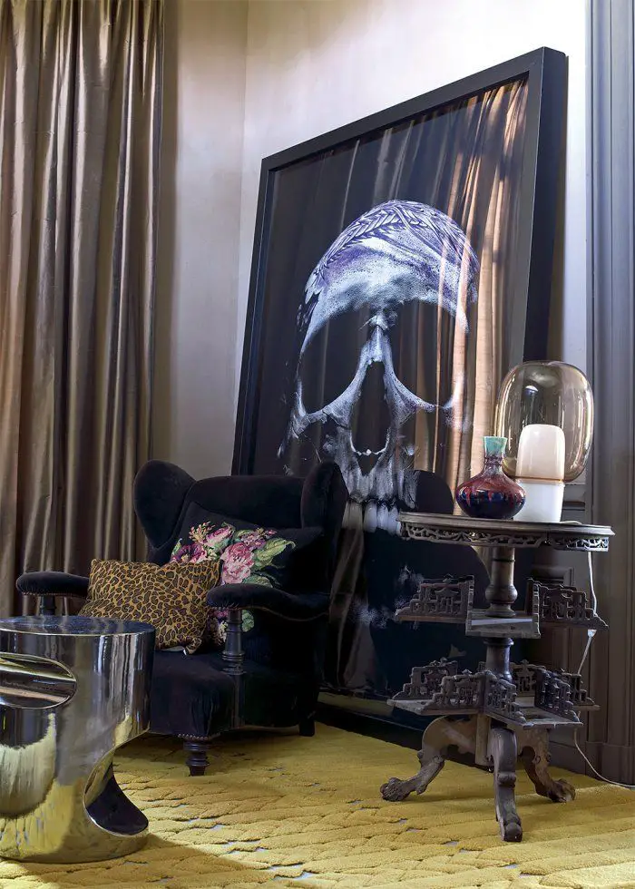 Deuxième cliché dont perso je raffole: la tête de mort. J'ai un tableau Pinterest dédié aux têtes de morts et aux squelettes, héhé! Pour le commun des mortels, la tête de mort est 1/ de mauvais goût 2/ trop lugubre 3/ ça ne leur viendrait pas à l'esprit d'en mettre dans leur déco (rayer la mention inutile si besoin). Sauf que la personne qui aime le rock ne voit pas de problème avec la tête de mort. Ca fait partie de l'imaginaire rock où la mort est omniprésente. Et non, avoir conscience qu'on va tous crever n'est pas lugubre, ça me semble beaucoup plus sain que de vouloir se croire immortel. Bref, la tête de mort dérange. J'aime cet objet qui peut servir de déco parce que j'y vois un Memento Mori au sens strict du terme. La tête de mort fait elle aussi partie de l'ensemble des symboles du Memento Mori dans la peinture hollandaise du XVIIème siècle. (N'oublions pas que j'ai un corbillard tatoué sur la cuisse gauche...) Revenons vite fait sur l'esthétisme de la tête de mort décorative. Elle peut être colorée/ Du noir pour les puristes. Du rose, du doré pour celles et ceux qui veulent associer la mort au fun. Elle peut-être en plastique, elle peut être en bois. Elle est déclinable à l'infini pour coller au mieux à vos envies du moments!