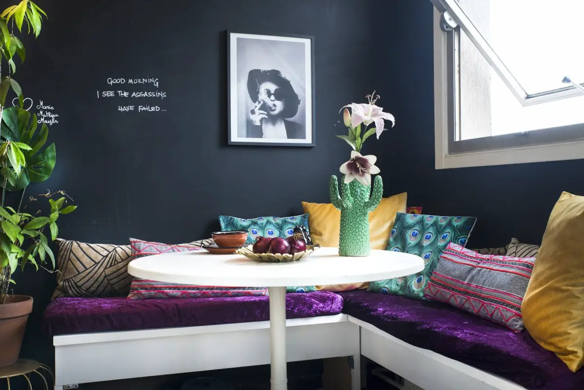 Même si les couleurs sombres en ce moment sont tendance et que le noir commence à plaire, il reste délicat pour la plupart des gens d'utiliser le noir pour décorer. Un joli mur noir mat peut-être très sympa visuellement. Cependant, la couleur ne se trouve pas uniquement aux murs. Le noir peut être sur le canapé. Un joli canapé noir en velours pour un côté chaleureux et un poil vintage. Le noir peut se trouver sur le tapis pour attirer le regard au centre de l'espace télé. Le noir peut aussi avoir sa place sur le mobilier. Une jolie bibliothèque noire mettre en avant les livres qu'elle contient pour décorer.