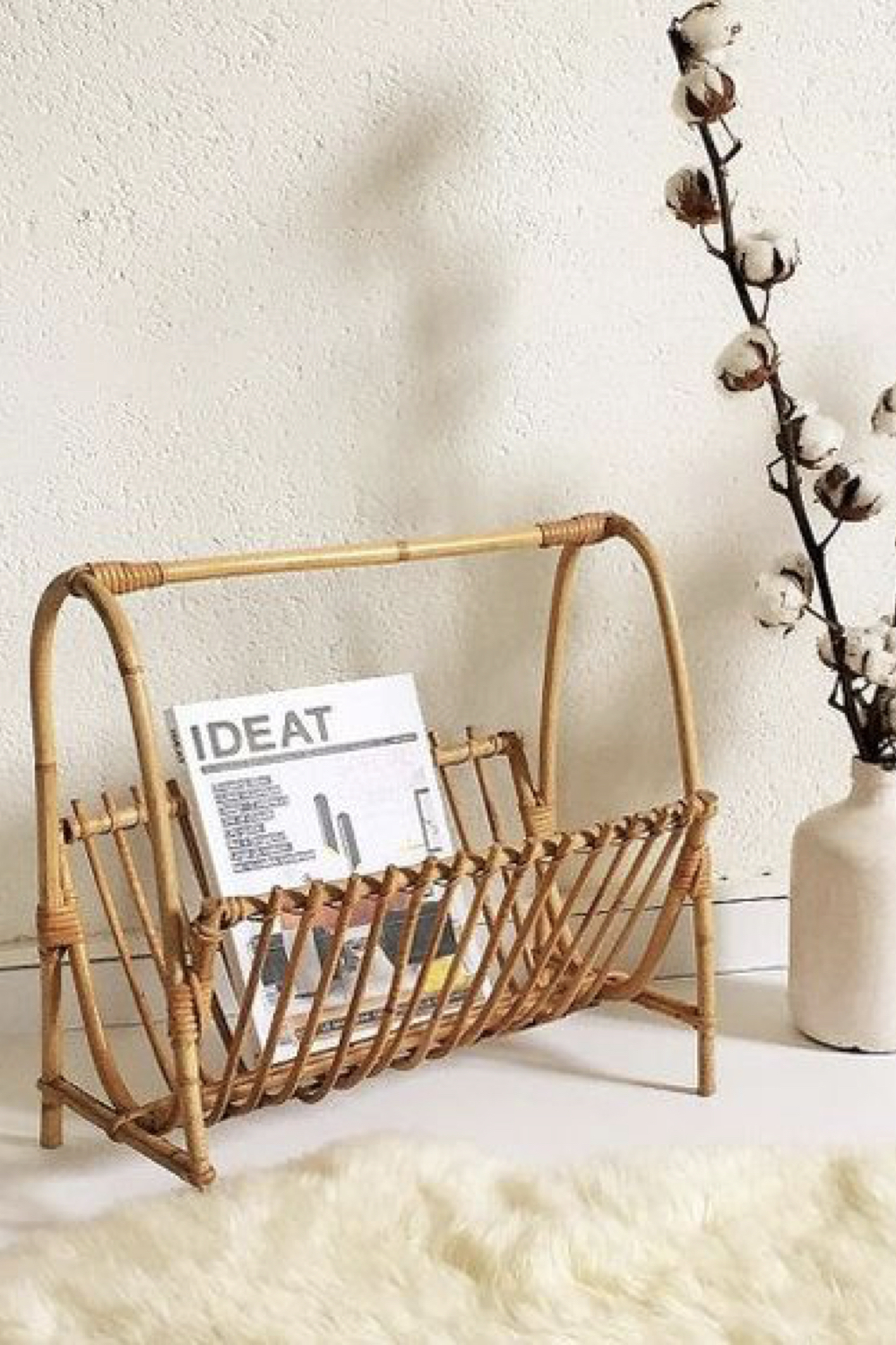 Chez Decoclico: 1. porte-revues en rotin 2. meuble d'appoint à poser en rotin 3. Porte-manteau mural en rotin 4. bibliothèque en rotin et en verre