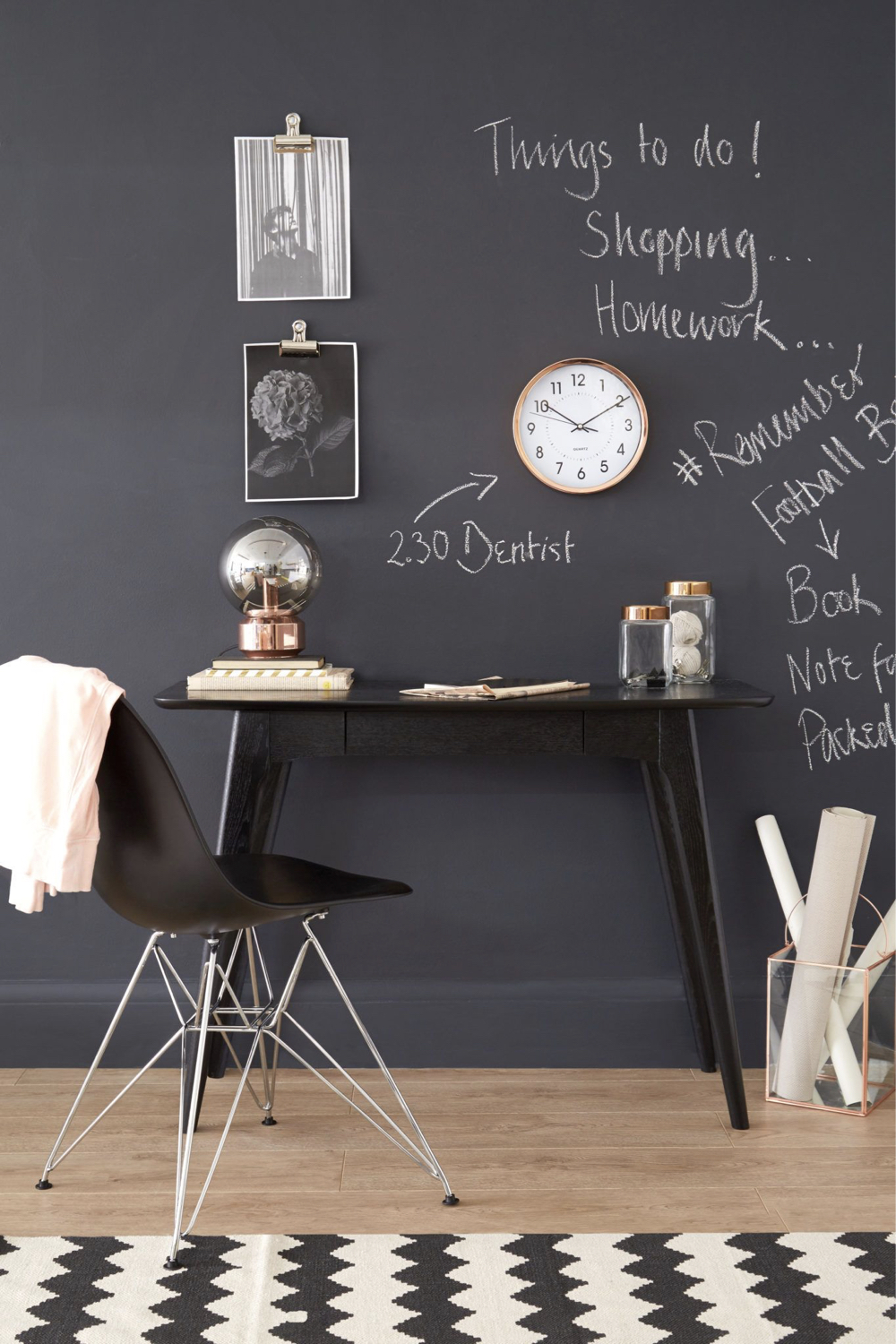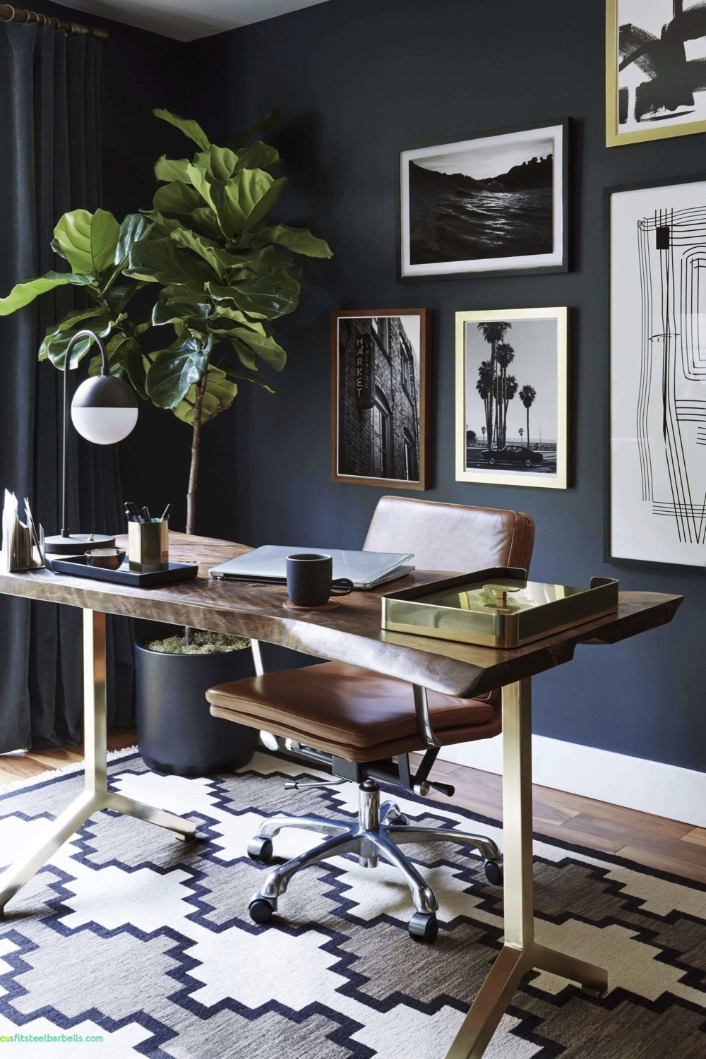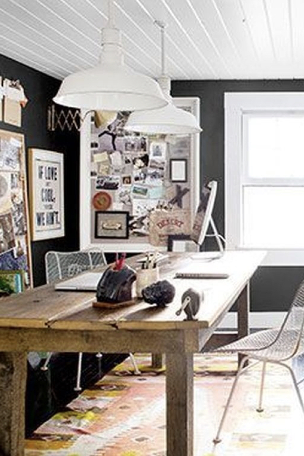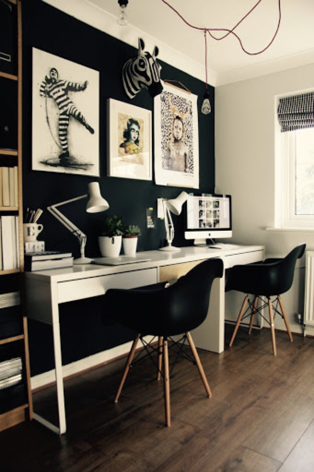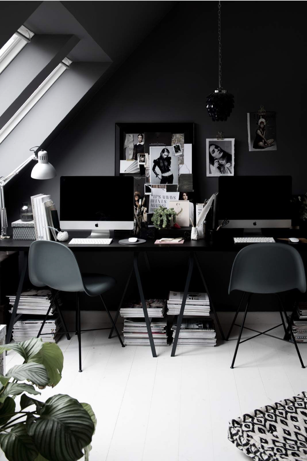 En contraste avec le blanc que nous venons de voir, le noir est une autre couleur tendance pour les espaces de travail. Le noir est une couleur profonde qui invite à la concentration. En revanche, contrairement au blanc, le noir crée une atmosphère plus intime dans votre pièce, une sensation de réconfort. C'est une couleur qui fait qu'on se sent bien dans la pièce même si on y travaille. Tout comme le blanc, le noir s'accessoirise très facilement. C'est une couleur idéale pour mettre en valeur votre décoration murale comme des photos ou des affiches. Si vous choisissez le noir comme couleur dominante pour votre bureau, il sera nécessaire d'apporter une attention toute particulière à votre éclairage pour que votre espace de travail soit agréable en toute saison et à tous les moments de la journée. Il vous faudra au minimum une suspension pour éclairer la pièce globalement et une lampe de bureau pour un éclairage d'appoint, même si vous travaillez essentiellement sur ordinateur.