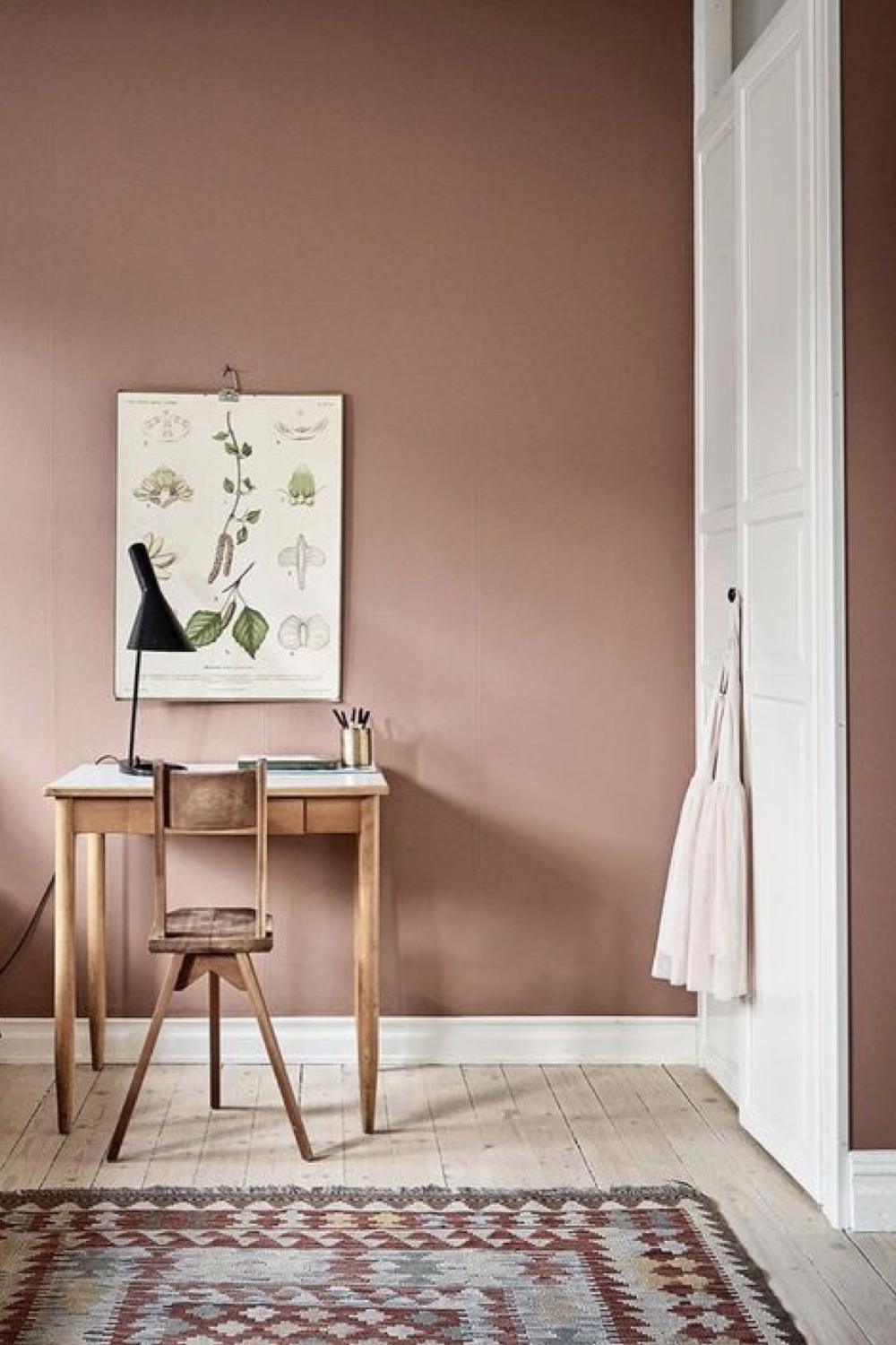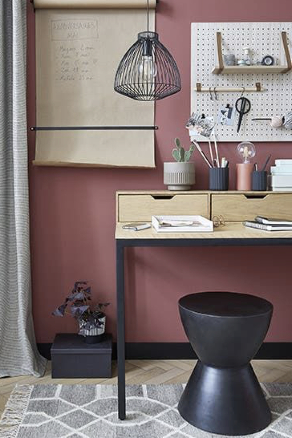 Le rose est connoté, c'est comme ça, du moins dans la culture occidentale. Et donc le rose dans un bureau va créer une ambiance féminine très rapidement. C'est une couleur qui est lumineuse quand elle est dans des tonalités claires. C'est aussi une couleur chaleureuse et enveloppante. On s'y sent en confiance. Attention néanmoins à ne pas utiliser un rose trop criard qui pourrait nuire à votre concentration. Si vous cherchez à créer une atmosphère plus douce pour travailler, le rose blush ou le rose poudré son parfaits et on peut facilement les associer avec du gris. On peut aussi penser au rose nude qui va parfois tirer vers le marron ou vers le beige, une autre forme d'élégance et de naturel.