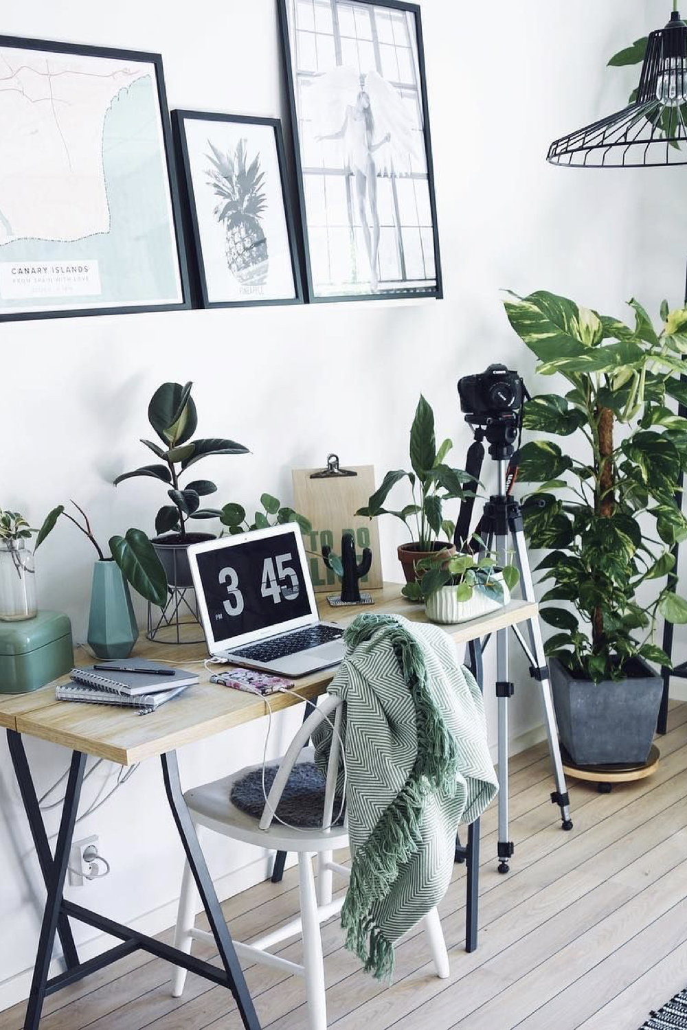 On peut aussi penser à intégrer un bureau scandinave dans une décoration plus nature, avec du vert et des plantes. C'est probablement la solution qui me plait le plus, j'aime être entourée de plantes quand je travaille. Elles rendent la décoration vivante et elles ont la faculté d'ouvrir la pièce sur l'extérieur. On ne se sent plus aussi enfermé(e) quand il y a de nombreuses plantes dans une pièce. C'est parfait pour s'aérer l'esprit entre deux tâches ou quand il fait moche.