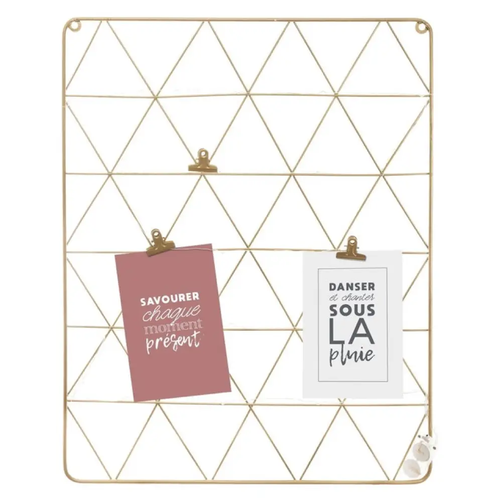 Références: 1. organisateur de bureau couleur or (d'autres couleurs dispo) 2. moodboard géométrique 3. petit moodboard lumineux 4. moodboard couleur laiton 5. moodboard noir 6. moodboard avec rangement 7. moodboard hexagonal 8. grand moodboard 9. moodboard 10. moodboard paravent 11. moodboard carte du monde 12. pegboard (made in France)