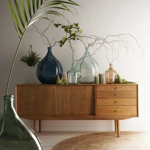 J'ai déjà consacré un grand nombre d'articles au plantes d'intérieur. Elles sont tendance. Elles mettent de la vie dans votre déco. Et le mieux, c'est qu'elles se plient à toutes vos envies ou presque. C'est donc assez naturellement que les plantes vertes trouvent leur place dans un intérieur mid-century. Le vert des plantes s'accorde à merveilles au bois foncé des meubles. Pas besoin de transformer votre intérieur en réplique de forêt tropicale, une ou deux plantes peuvent suffire à créer une ambiance plus contemporaine autour de votre buffet. C'est idéal dans le salon, dans la salle à manger ou encore dans l'entrée si vous avez un petit meuble 2 portes par exemple.