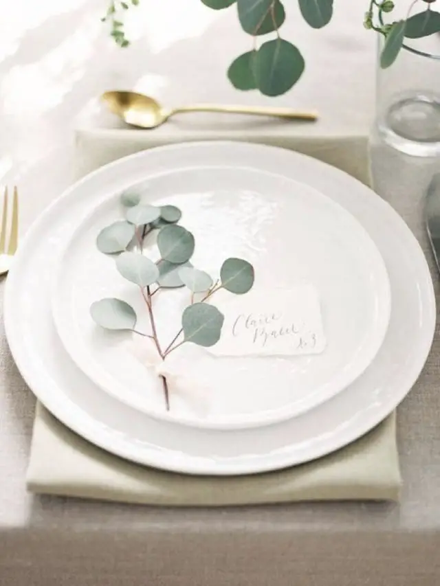 Les marque-places sont parfait pour contribuer à cette petite touche en plus. Ils donnent en un clin d'oeil une impression festive à la table. Ici, l'eucalyptus est couplé aux couverts dorés et au marque-place, au centre de l'assiette et au dessus d'une jolie serviette de table. C'est à la fois simple et festif. Le doré des couverts contribue à cette idée de fêtes.