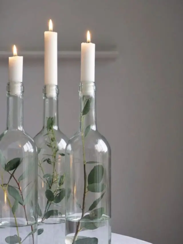 Comme vous pouvez le voir sur l'image, on frôle une fois encore la simplicité extrême et pourtant c'est très déco. On a besoin de bouteilles en verre blanc, de branches d'eucalyptus et de bougies blanches. Sur une cheminée ou même sur un buffet, cela peut être la petite touche élégante et raffinée qui manque à votre déco de fêtes. Cette composition peut aussi prendre place à table évidemment.