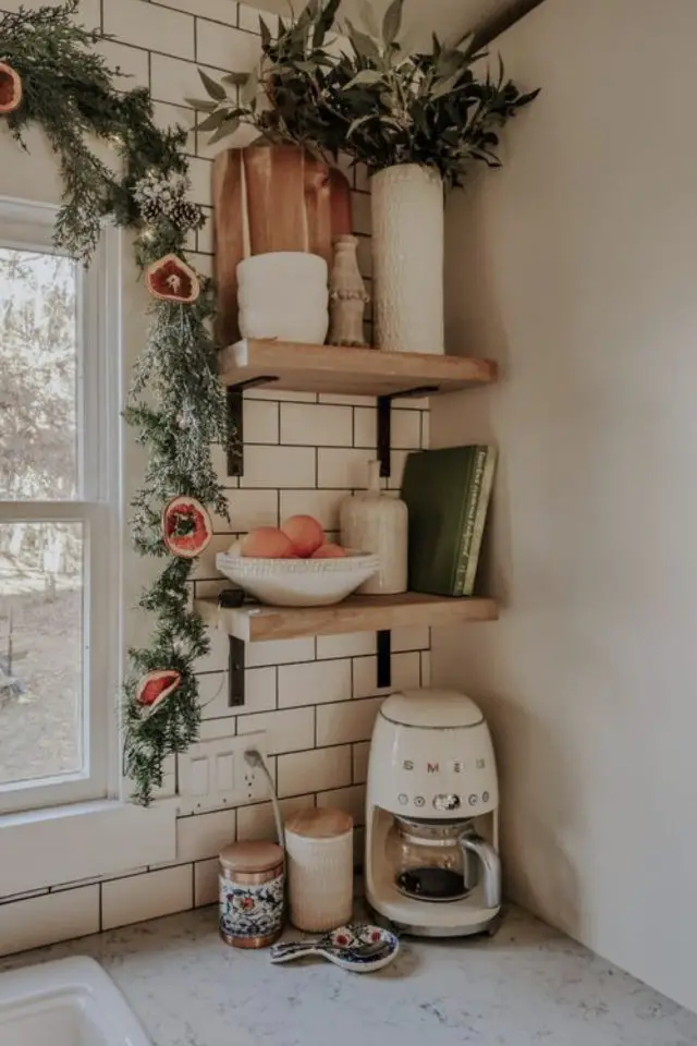 En ce moment, je ne sais pas pourquoi je fais une fixation sur les étagères. J'ai d'ailleurs créer un tableau Pinterest sur cette thématique si ça vous intéresse. Les étagères dans la cuisine peuvent prendre différentes formes. On peut les trouver pour habiller un angle. On peut aussi les trouver entre deux meubles muraux ou à côté de la fenêtre. Elles vont vous permettre de donner un autre rythme à votre déco murale. Dans la cuisine, la déco murale doit se lessiver facilement - même avec une hotte aspirante, c'est une pièce assez grasse et les étagères normalement se nettoient rapidement et sans trop de difficultés.