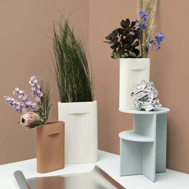 J'ai un coup de coeur pour les soliflores en béton de Gone's - une entreprise française basée à Lyon. J'aime la simplicité du béton. J'aime aussi le contraste de la douceur des fleurs avec le côté brut de la matière.