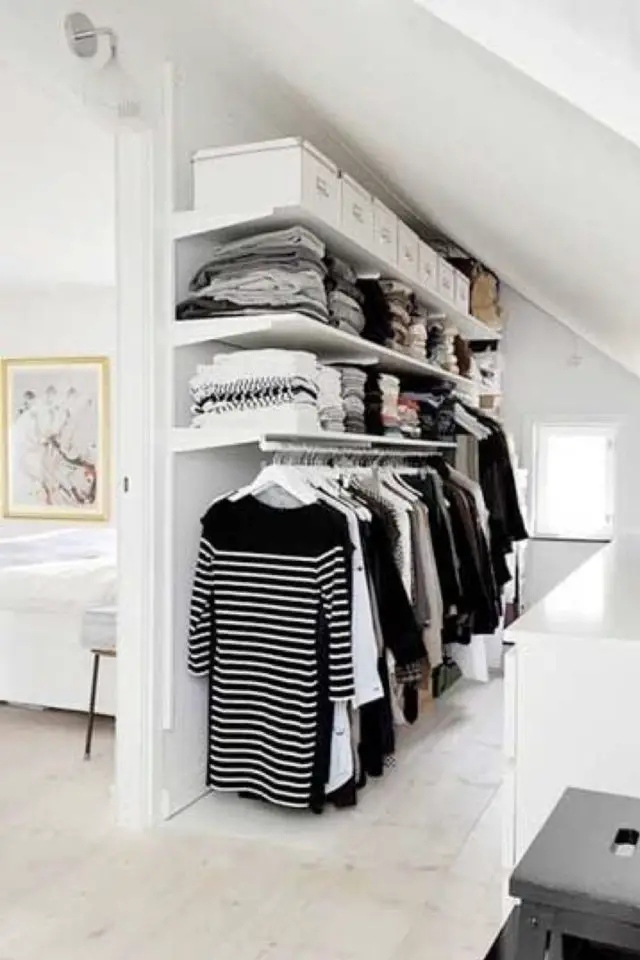 Commençons par des solutions qui ne coutent pas nécessairement très cher à mettre en oeuvre pour aménager vos combles en dressing. Ici, il est question de faire vous même le sur-mesure pour que votre aménagement corresponde à votre espace. Le résultat n'est pas forcément moche, en revanche, il est plus compliqué d'avoir un dressing avec des portes qui cachent votre rangement. Les solutions qui s'offrent aux petits budgets créent des rangements modernes et fonctionnels.