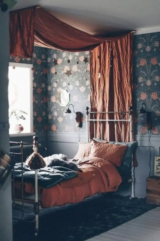 On va commencer avec une combinaison très classique chic: l'association du lit en métal pour enfant avec un papier peint aux motifs floraux. On peut partir sur des petites fleurs en imprimé comme du liberty. On peut aussi associer le couchage vintage avec un papier peint à grosses fleurs. Le motif à fleur n'est pas exclusivement pour les petites filles. Ca ne me choque pas de voir un chambre de bébé garçon avec des petites fleurs. Elles symbolisent tellement de choses comme la douceur, la poésie ou le renouveau. En revanche, peut-être qu'en grandissant, votre fils vous demande un autre papier peint qui correspondra un peu plus à ces centres d'intérêts. Pour éviter le côté trop kitsch du papier peint fleuri et du lit à barreau en métal, n'hésitez pas à choisir des couleurs modernes: du pastel, du poudré ou même pourquoi pas des nuances sombres qui vont renforcer l'idée de cocon bienveillant qu'on essaye de créer dans la chambre des enfants.