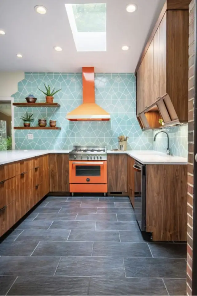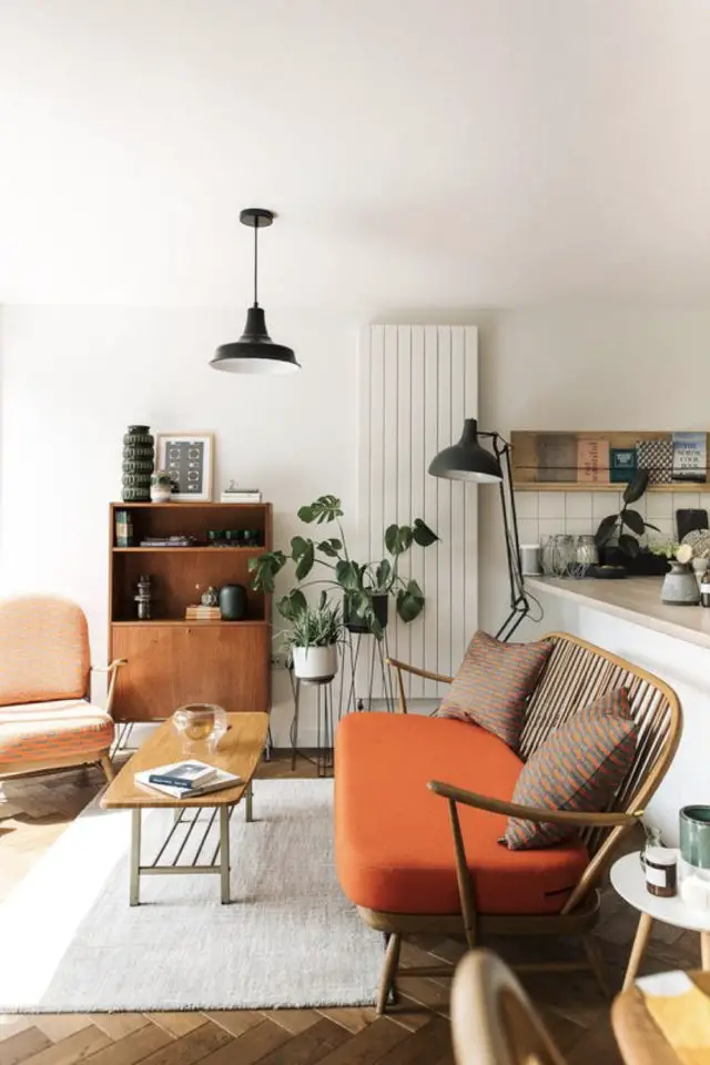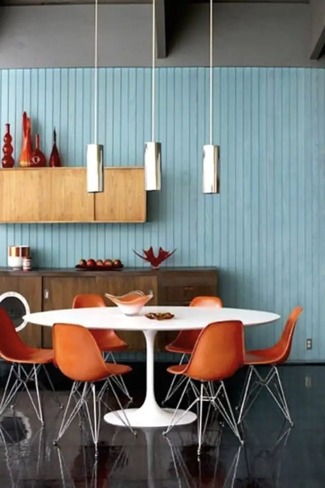 A cette époque, le orange permet de créer du contraste aussi. On l'associe avec un bleu clair et on obtient un contraste chaud / froid qui offrira à votre intérieur un côté résolument rétro! Ce contraste ce caractérise aussi dans la proportion des couleurs. Un grand volume de couleur froide pour quelques pincées de couleur chaude. On équilibre le tout avec du blanc et du bois.