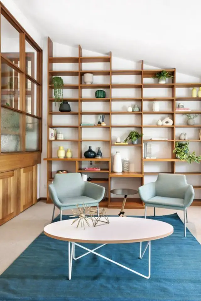Que dire du bleu mid-century? Comme les autres couleurs, il s'utilise soit en petites touches soit sur un pan de mur entier. La question de la couleur facile à vivre se pose justement quand il est question de gros volumes de couleur. Dans les décors mid-century, le bleu même s'il est associé au blanc, ne donne pas un effet bord de mer. Il est plus étonnant. On ne va pas s'attendre nécessairement à trouver du bleu pour relever un intérieur essentiellement composé de blanc et de bois.