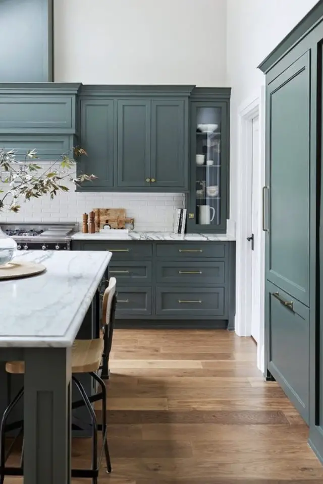 Si vous n'avez pas envie de neutres, pourquoi ne pas opter pour une couleur plus poudrée? On peut choisir du vert ou du bleu. Ce sont des couleurs faciles au quotidien, des couleurs reposantes. Le rose peut aussi avoir sa place dans une cuisine classique chic mais il est plus rare. Il est souvent trop connoté féminin et trop moderne. Ces couleurs sont souvent associées à du blanc ou à un neutre très clair sur les murs pour ne pas perdre en luminosité.
