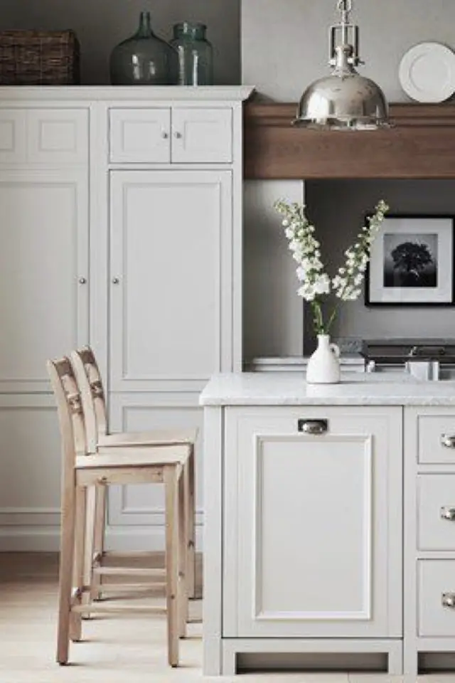 On passe à un point de taille: les meubles de cuisine. Peu importe le style, ils ont toujours une place de taille dans un projet déco. On ne peut pas les laisser de côté. Dans le style classique chic, le mobilier de cuisine est généralement coloré et travaillé. Les façades vont avoir du relief, simple mais présent. (Evitez trop de fioritures sur les façades de cuisine, n'oubliez pas qu'il est impératif de les lessiver une fois de temps en temps!) Côté couleur, je vais y revenir après, mais on peut d'abord noter une prédominance des couleurs neutres et douces. On va trouver des meubles de cuisine en gris ou en beige mais aussi des meubles bleu ou vert. Ce sont des couleurs qui apportent de la quiétude. Le blanc peut aussi être une option dans une cuisine classique chic pour atténuer un trop plein de motifs ou pour rendre l'espace plus lumineux. Comme pour l'histoire du robinet, pour les meubles de cuisine dans le style classique, ce sont les poignées et boutons de portes qui vont faire la différence. Choisissez avec soin la petite quincaillerie.