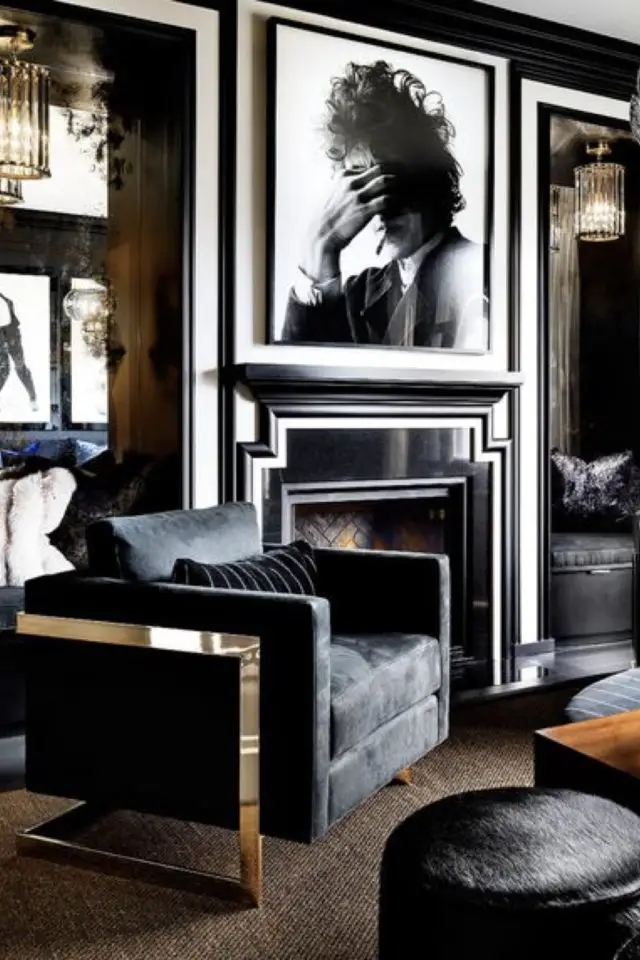 Pour dynamiser un peu cet intérieur qui peut être très sombre, on peut compter sur le doré. Pas en grande quantité. Ce n'est pas nécessaire. Il va apporter un peu de luminosité et créer du contraste. L'or se retrouve facilement dans les détails: les encadrements, les poignées de portes, les luminaires... Je suis consciente que le doré n'est pas forcément la cam' de tous. Pour garder l'idée de contraste et de luminosité, le blanc est moins bligbling mais tout aussi efficace.