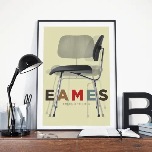 Il y a différents points qui vous permettront de finaliser votre décoration: les textiles, les accessoires déco, les luminaires... Ce sont ces petits détails qui vous donneront le sentiment que l'ambiance de votre pièce est bien équilibrée. La décoration murale et les cadres en font partie. Si vous avez déjà un meuble ou un fauteuil mid-century, une jolie affiche vous permettra de faire un rappel dans votre pièce. Il y a quelques années avec le style scandinave, les chaises Eames ont eu un très grand succès et vous en avez peut-être chez vous dans la salle à manger, la cuisine ou encore le bureau. Au lieu de changer l'intégralité de votre décoration, vous pouvez la faire évoluer en changeant quelques détails. Les cadres sont une manière économique de procéder au changement. Ils coûtent généralement moins cher que les meubles!