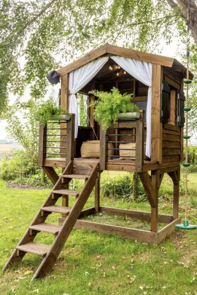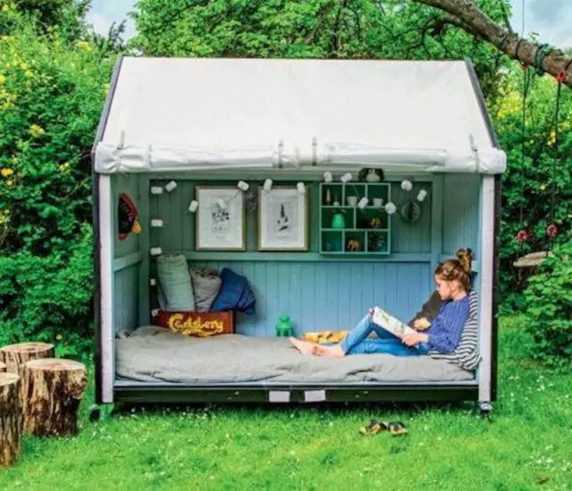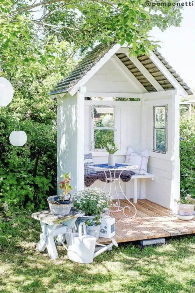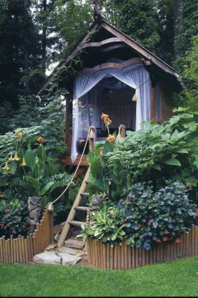 On vient de le voir, le chalet de jardin n'est pas nécessairement un espace qui permet de ranger l'outillage. Pour ce 3ème point de l'article, il est question de détente puisque le cabanon se transforme en abri pour se protéger d'un excès de soleil ou même de la pluie. Un toit, deux ou trois murs, des assises confortables et voilà, le tour est joué, vous avez un espace agréable pour faire la sieste, lire un bouquin ou tout simplement contempler le jardin. J'aime beaucoup les cabanes sur-élevées mais en ville, il peut être plus compliqué d'en installer une. Il y a des règles d'urbanisme qui régissent la hauteur des clôtures, je pense que le chalet ne doit pas les dépasser non plus. Si vous n'entretenez pas de bonnes relations avec votre voisinage, la hauteur du chalet de jardin peut devenir source de conflits.