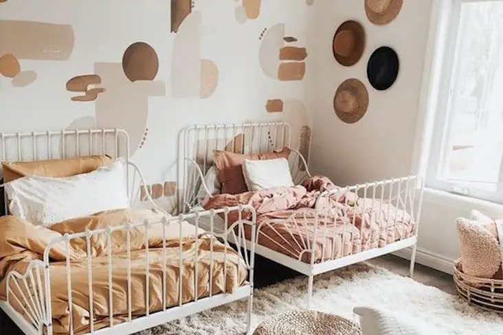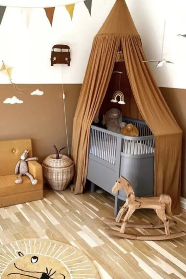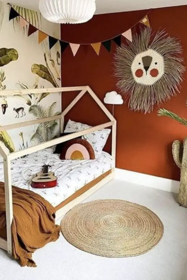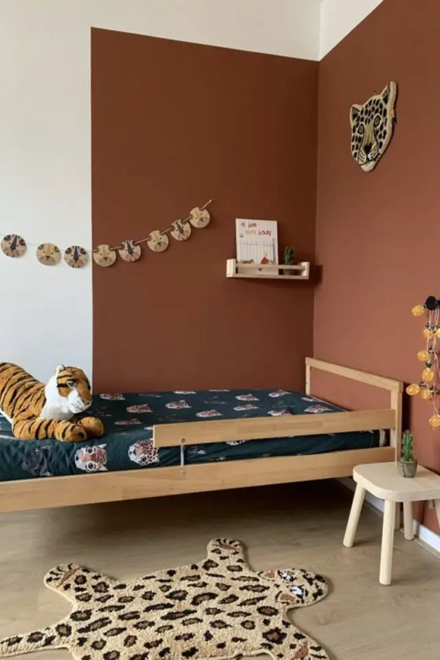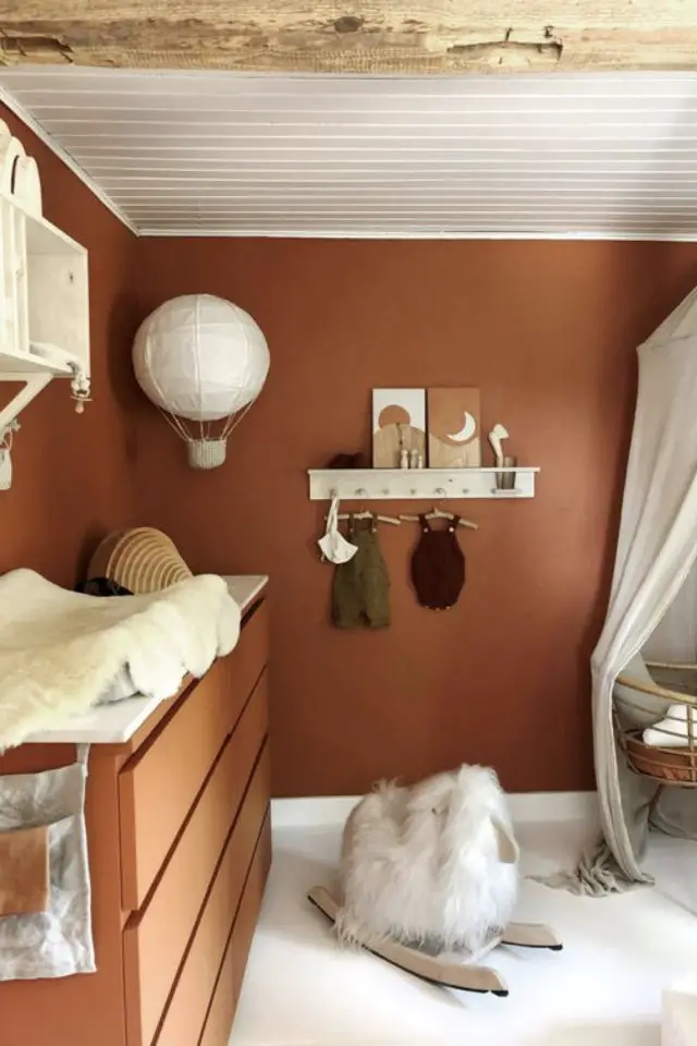 Je termine cette sélection de chambres d'enfants avec les couleurs modernes et tendances. Ce sont des couleurs qu'on trouve aussi bien dans une chambre qu'ailleurs dans la maison. En ce moment, on a le terracotta, le vert sauge et l'ocre. Ce qui est intéressant c'est que ce sont des couleurs organiques qui trouvent leur source dans la nature. Et cette thématique est intéressante à plus d'un titre. Elle apporte de la douceur. Elle est aussi synonyme de bienveillance. Et un peu plus loin dans l'idée, je pense qu'une couleur naturelle ne se choisit pas par hasard et qu'elle montre un certain intérêt quant à la nature de la part des parents.