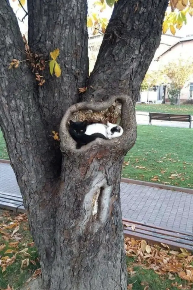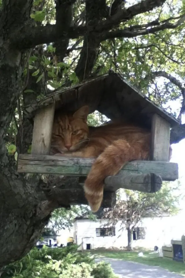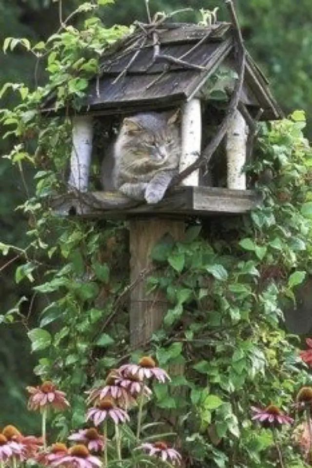 Commençons donc cette pause dans le jardin. Que ce soit en intérieur, comme en extérieur, les chats aiment être perchés. Tout est bon pour prendre de la hauteur: poteaux, arbres, boites aux lettres, nichoirs pour les oiseaux... Si vous vivez à la campagne ou dans une petite ville verdoyante, ouvrez les yeux lors de vos promenades, vous croiserez peut-être un chat caché où on ne l'attend pas!