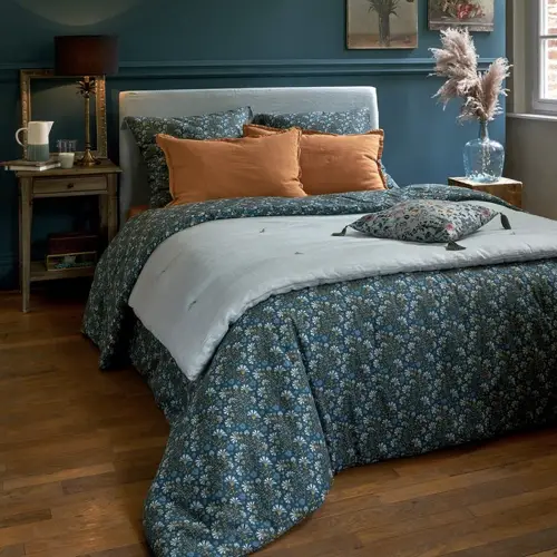 Références: Housse de couette en lin lavé; lit avec tête de lit en chêne massif; fauteuil bleu nuit; canapé 2 à 3 places; coiffeuse en chêne