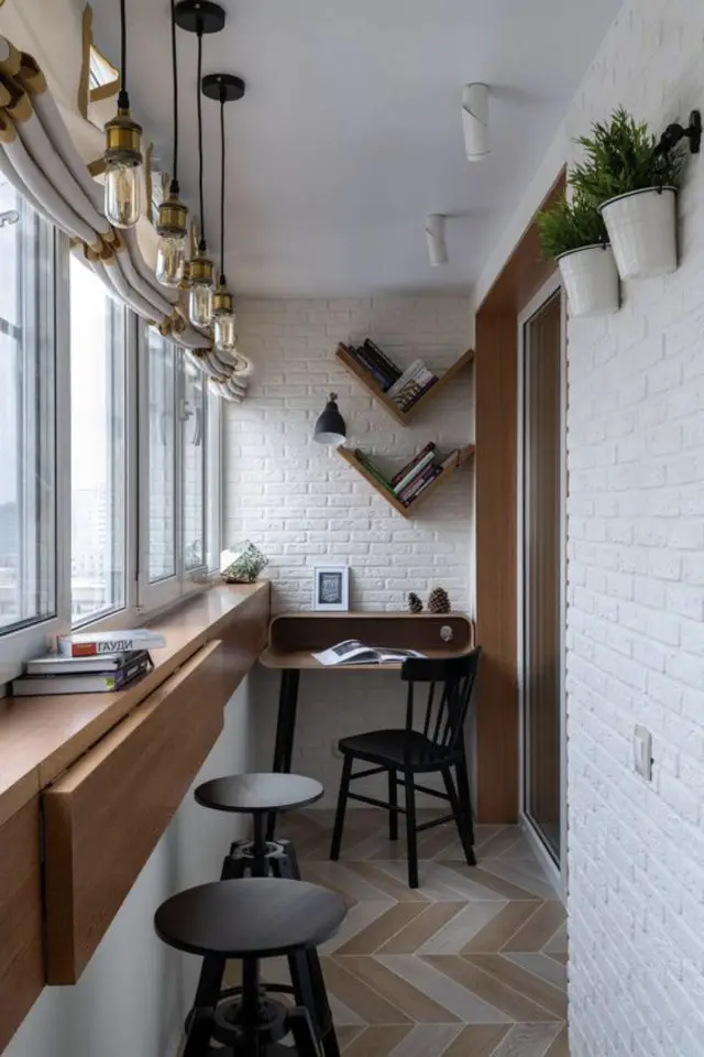 Niveau déco, cette loggia bien que petite offre pas mal d'idées dont s'inspirer. D'une part, c'est un univers lumineux et chaleureux. Le blanc n'est pas uni, c'est un papier peint effet brique qui donne de la consistance, du volume. On peut aussi noter la présence du bois sous différentes formes: le sol en parquet chevrons, le bureau et les étagères, la tablette, les assises qui sont en bois mais une teinte plus foncée. Il y a aussi l'habillage du châssis de fenêtre qui est en bois. Il souligne la forme longiligne de la loggia mais surtout il crée une cohérence sur l'ensemble de l'espace.