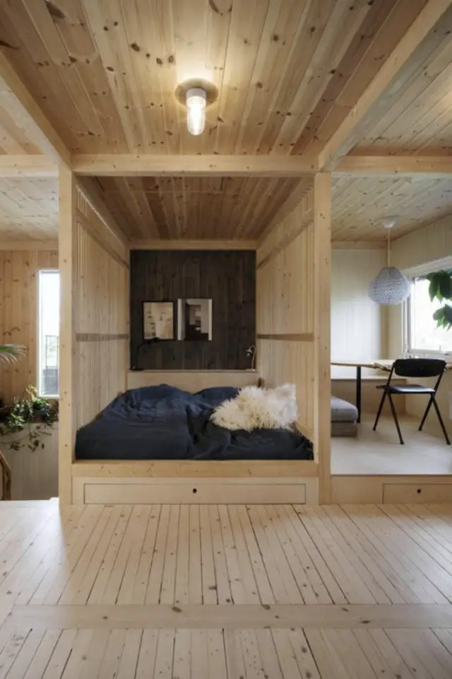 Sur cette image de petit intérieur, on voit aussi que ce n'est pas le seul espace en "boite" et cloisonné de cette manière. Juste à côté on aperçoit une table, une banquette et une chaise. Un espace repas ou peut-être un espace travail? Là aussi, il n'y a pas la place au superflu. Même l'encadrement de la fenêtre est minimaliste. Pour rester sur cette idée, on peut observer les couleurs et matériaux qui composent l'ensemble: du bois de différentes essences, du noir et une touche de gris. Rien de plus et pourtant l'ensemble est chaleureux.
