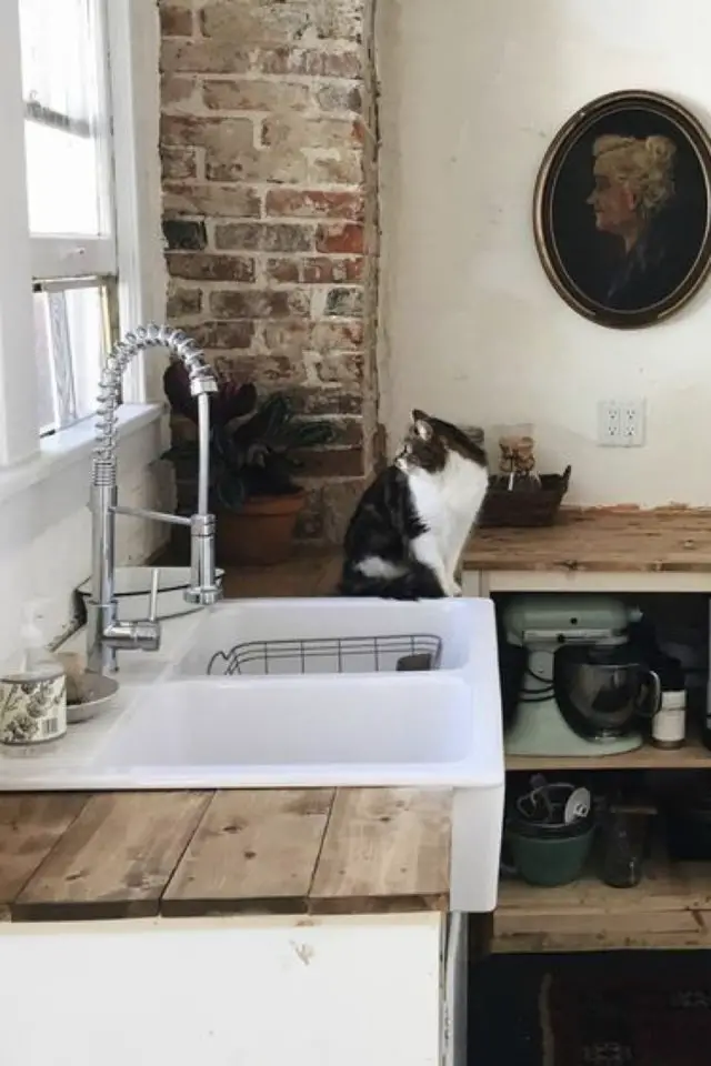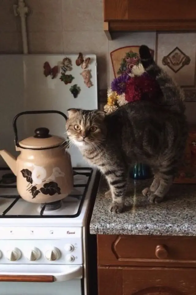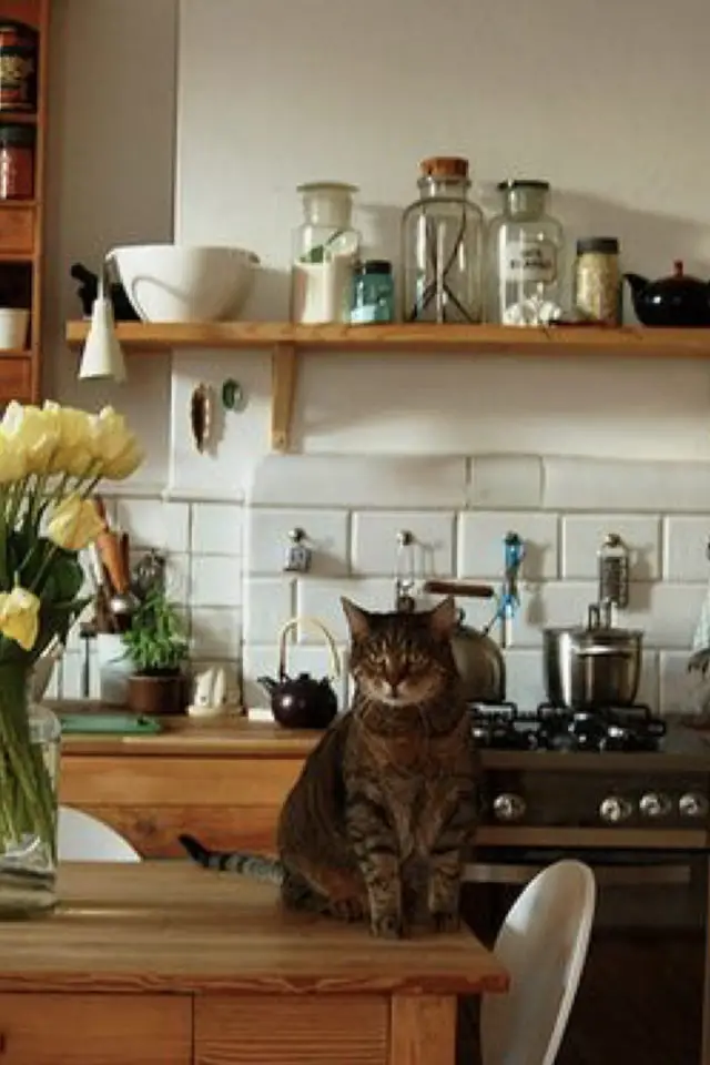 Un chat dans la cuisine, ce n'est pas forcément ce qui est de plus hygiénique. En même temps, c'est pas comme si les chats attendaient votre autorisation pour grimper sur le plan de travail ou la table de la cuisine dès que vous avez le dos tourné! L'expression: "vivre chez son chat" prend tout son sens dans ce cas là. Et si on essaye de voir la cuisine comme un chat, c'est un terrain de jeu extraordinaire! On peut grimper un peu partout: sur le plan de travail, sur la table, sur le rebord de fenêtre ou encore sur la gazinière. Et avec un peu de bol, l'humain aura laissé un peu de nourriture trainer. C'est tout bénéf! (C'était le chat de mon frère Antoine... Marichou... Elle volait tout le temps de la bouffe au début. Il ne fallait rien laisser trainer même si on était à côté.)