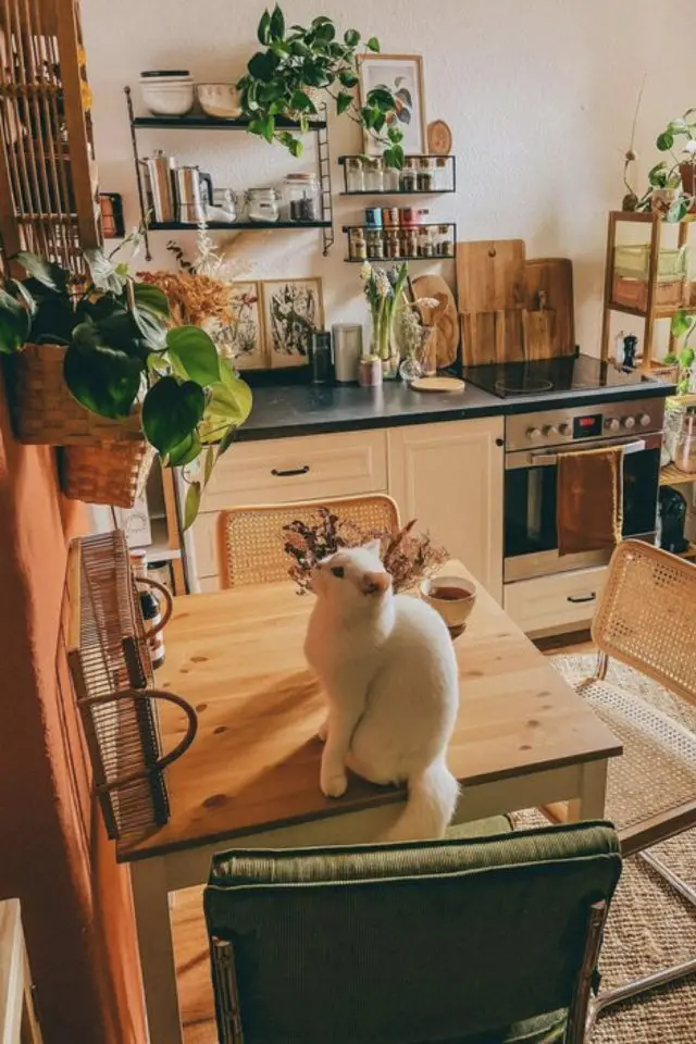 Tous les propriétaires de chats vous le diront, un chat squatte là où il a envie. On peut bien lui acheter un coussin ou un panier dédié, s'il n'a pas envie d'y aller, il n'ira pas dessus. Alors parfois, on fait des arrangements. On ajoute un plaid dans un panier, celui que le chat s'est approprié. On ajoute un coussin. On retire la plante parce que le félin a décidé que c'était sa place... Bref, l'irrévérence déco du chat chez lui.