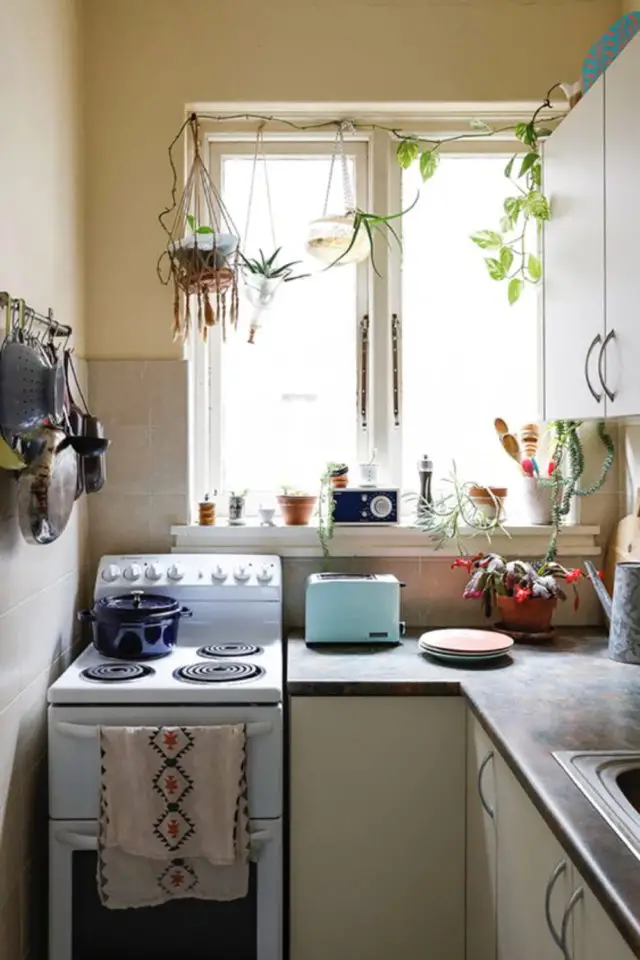 Elle me réconforte aussi mais là c'est grâce à la décoration. Là aussi pas de chichis et ni d'extravagance. On a quelques plantes qui décorent le châssis et le haut de la fenêtre. On a aussi les ustensiles de cuisson accrochés au mur à proximité de la cuisinière. Pratique et efficace. Cette cuisine est un espace qu'on a envie d'utiliser au quotidien même si elle n'est pas très large et même si on n'a pas la place pour y manger. Parfois la simplicité est le meilleur axe pour décorer une petite pièce et la rendre confortable.