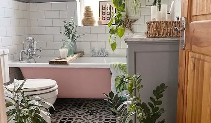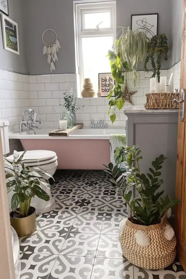 Le choix des couleurs est le premier point important de ce décor de salle de bain. Il y a en a 3 principales: Le blanc pour la faïence au mur, l'intérieur de la baignoire et les toilettes. Il apporte de la luminosité et contribue à la sensation d'espace. On a aussi une grande part de gris clair: au dessus du soubassement, sur les motifs du revêtement de sol, sur le meuble vasque. Et puis, il y a une unique touche de rose sur l'extérieur de la baignoire. Cette présence de couleur au singulier attire le regard et met l'accent sur l'élément le plus important de la petite pièce: la baignoire.