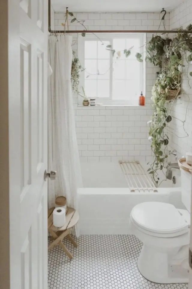 Le 2ème point déco qui me plait dans cette salle de bain riquiqui ce sont les plantes. Certaines sont suspendues au plafond au dessus de la baignoire. Elles sont dans les angles et donc ne dérange pas quand on est debout pour prendre la douche. Il y a aussi un pot suspendu à la barre de douche, à l'extrémité de l'emplacement de la douche (comme ça, on n'éclabousse pas le sol même si le rideau de douche n'est pas fermé entièrement). J'ai déjà eu l'occasion de vous parler de l'intérêt des plantes dans toute la maison et aussi dans la salle de bain. Elles apportent de la couleur et de la vie à votre pièce.