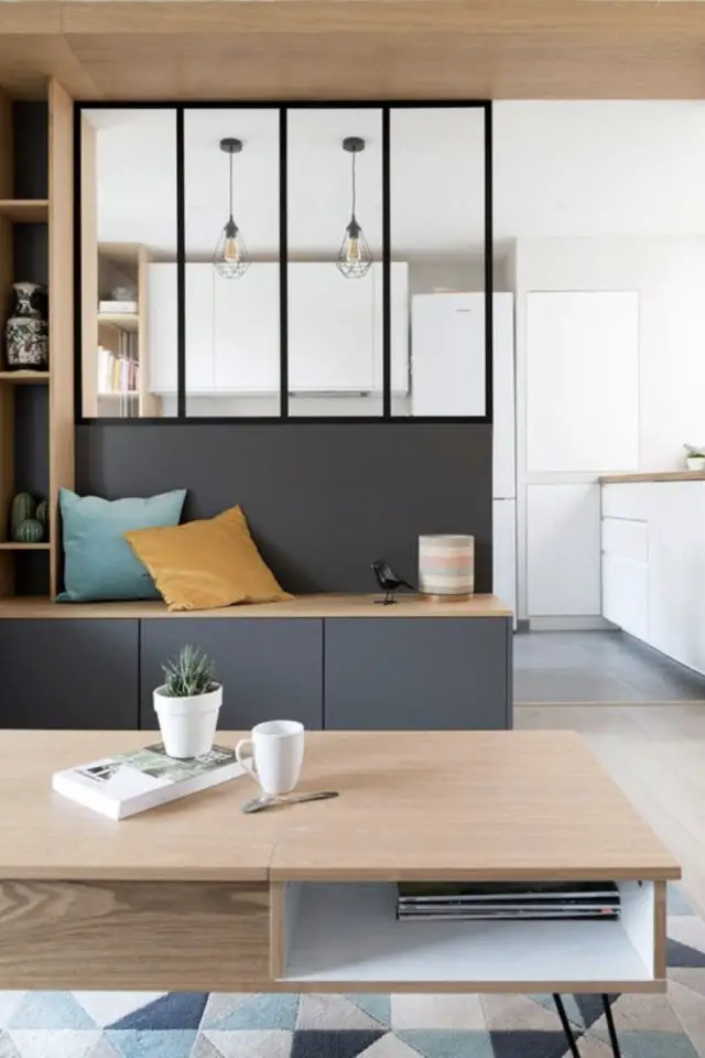 Utiliser la verrière dans une petite cuisine est un atout. L'espace n'est pas figé et obstrué comme avec une cloison pleine et classique, on voit la pièce attenante ce qui crée le sentiment d'avoir plus de place. L'espace de vie est tout de même délimité sans pour autant avoir l'impression de cuisiner dans un placard à balais. La verrière est aussi l'occasion de créer un soubassement qui peut être le support à d'autres meubles bas ou encore à une tablette pour prendre un repas sur le pouce. Le côté moderne de la verrière passe essentiellement par ses montants. On va chercher un ensemble assez épuré avec de grands montants verticaux (qui rappelleront de loin le style atelier / industriel) ou on peut aussi trouver des montants à grands carreaux. Ils seront plus fins que les montants verticaux et conféreront plus d'élégance à votre intérieur, même s'il est petit. Retrouvez ici des idees de réalisation de verrière pour la cuisine.