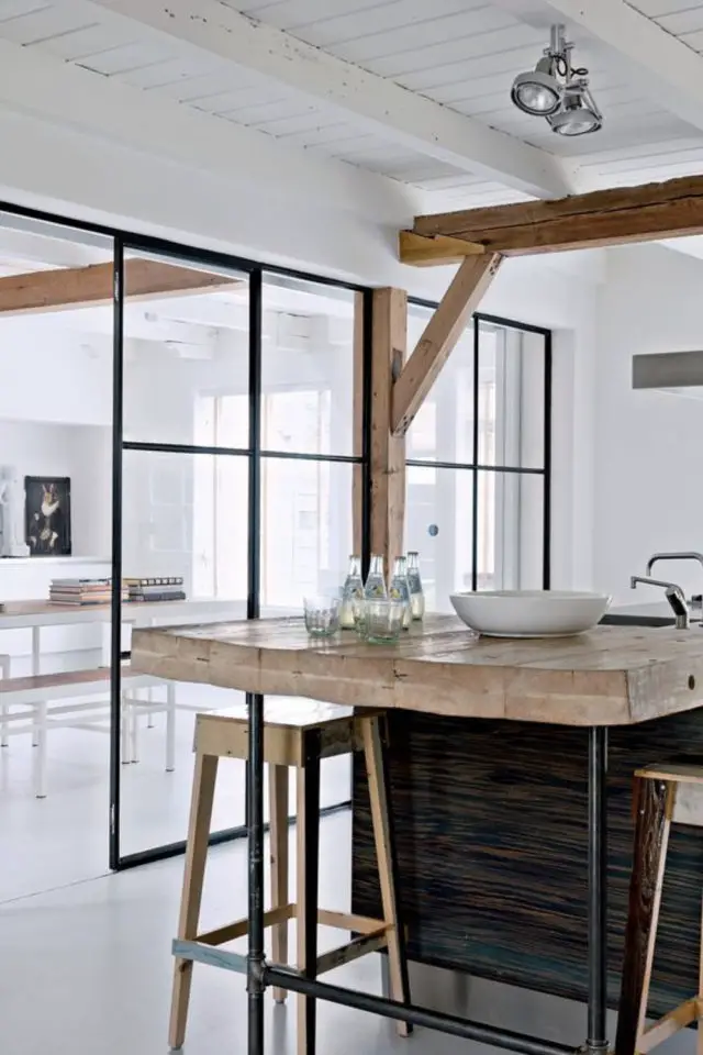 Si vous aimez les intérieurs et cuisines plus épurés, le mur vitré devrait vous séduire. Contrairement au point précédent, ici, il n'y a pas de soubassement. La verrière part du sol et monte jusqu'au plafond. Le jeu de transparence et le rythme créé par les montants offre beaucoup d'élégance. C'est esthétiquement assez simple mais la simplicité peut être très chic! Cette solution est parfaite si vous aimez les grands espaces ouverts avec du cachet.