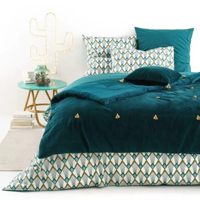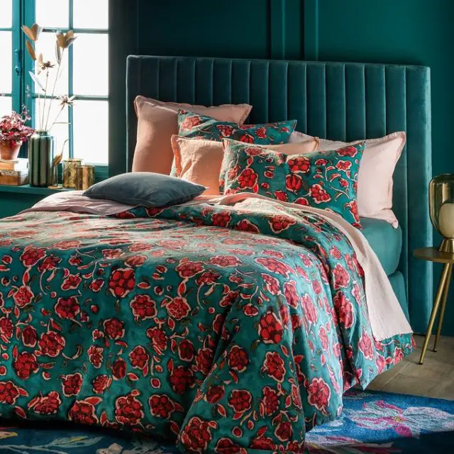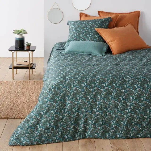 07 • Retour du vert - j'avoue, j'ai du me limiter en préparant cet article. Cette fois le verte est en 3 nuances différentes: un vert tendre en peinture sur le mur, un vert sapin en velours sous la forme de coussin, un vert clair encore sous la forme de coussin. Ce ton sur ton donne du rythme à votre déco de chambre sans trop abuser. Le vert n'est néanmoins pas la seule couleur présente. Sur le lit, les couleurs de la parure sont chaudes et créent un contraste agréable. Le vert crée un sentiment de fraicheur alors que lit nous appelle et nous dit: "viens, il fait chaud sous la couette!"