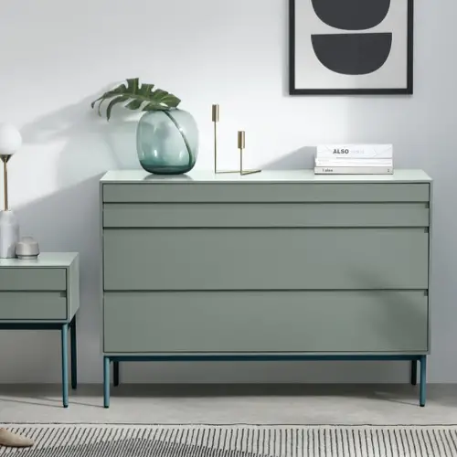02 • Plus tendance, la 2ème chambre associe plusieurs idées déco très modernes. D'une part on a une atmosphère bohème avec des imprimés colorés. D'autre part, on a le soubassement peint dans un profond vert sapin. On peut aussi noter la couleur dorée du bois des meubles mid century ou encore les affiches abstraites. C'est un peu comme si on avait mis tout ce qui marche en déco en ce moment dans un shaker et qu'on avait jeter le résultat dans la chambre à coucher!