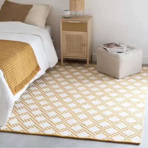 14 • Les motifs peuvent prendre de nombreuses formes, je ne vais pas vous l'apprendre. Les motifs géométriques sont toujours une valeurs sûres pour mettre une touche de couleur et pas uniquement dans la chambre. La géométrie est simple, abstraite. Elle fait équilibre avec la couleur. Et ici, les motifs géométriques et colorés habillent le dessus du lit. Ils donnent une nouvelle importance à l'espace sommeil.