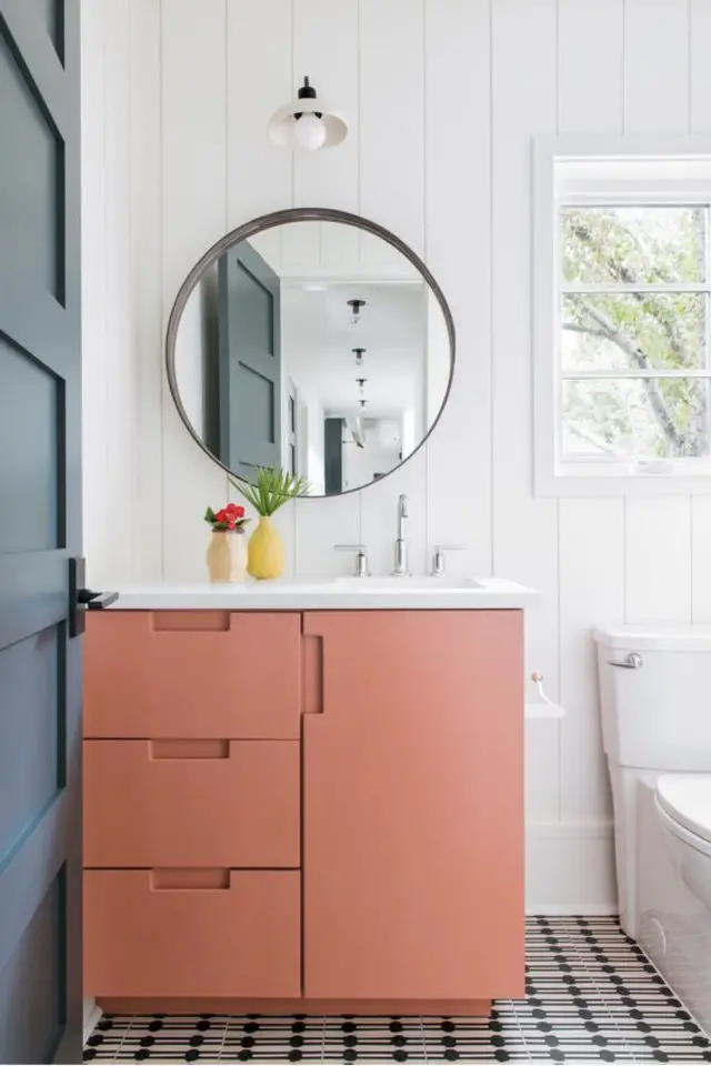 Pour la couleur, c'est une question de goûts. Ici le meuble vasque est dans une teinte chaude, vitaminée, un corail / terre-cuite moderne. A lui seul il rayonne dans la micro salle de bain. Il fait aussi contraste avec la porte peinte en bleu canard.