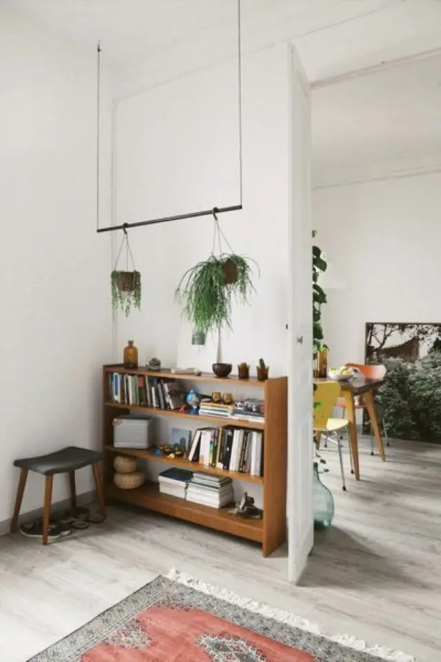 Ce petit aménagement reste déco: l'essence du bois très mid-century avec un petit tabouret dont les pieds reprennent cette couleur chaude et l'assise une touche de cuir. Mais ce qui est plus surprenant, c'est la barre accrochée au plafond pour suspendre deux pots et des plantes. ce détail permet de jouer à la fois sur la profondeur (être décalé du mur) et sur la hauteur (ne pas être posé sur le meuble). Un petit angle de pièce qui pourrait sembler banal ne l'est plus. Et il n'est pas encombré pour autant.