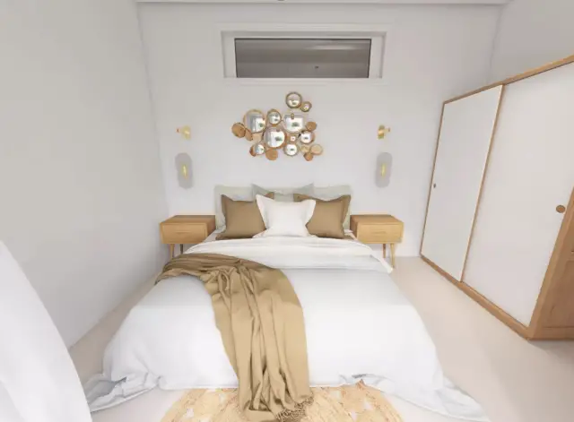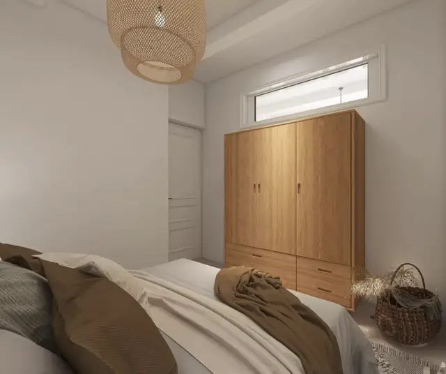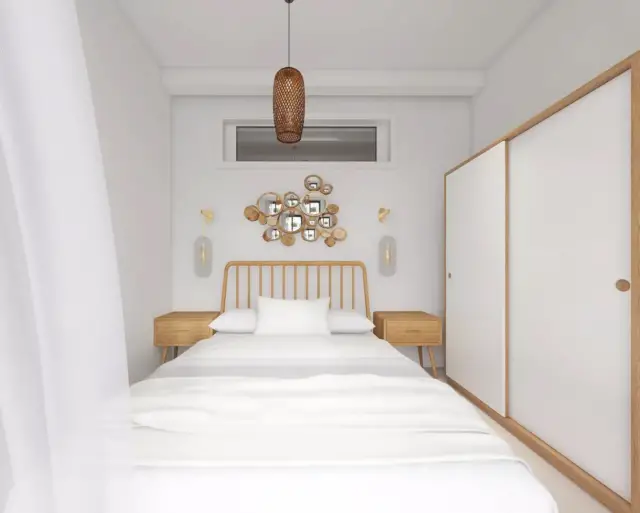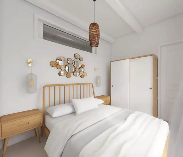 A. désirait avant tout une ambiance méditerranéenne avec une touche bohème chic. Ainsi Diane a été guidée vers des chambres aux inspirations nomades et une véritable invitation au voyage. Ce mélange de style séduit par sa simplicité et son esprit de liberté. Elle a opté pour des accumulations murales et des coussins associés à des tapis berbères, ou encore du mobilier privilégiant des matières naturelles avec tables de chevets en bois, des suspensions en paille et du linge de lit en lin ou en coton biologique. Diane a été amenée à réfléchir à un nouvel agencement qui permettait à l’une des chambres d’avoir vu sur la mer. En effet, un travail de métrage sur plan a été effectué pour obtenir ce résultat. Le résultat final est original et confortable, c’est un véritable cocon pour se déconnecter et se ressourcer.