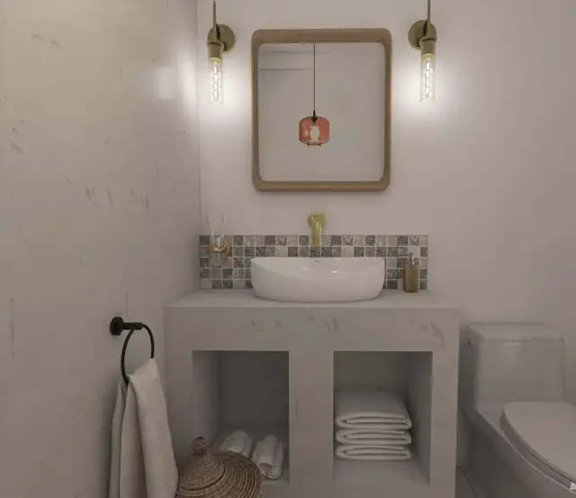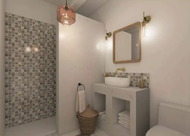 Pour la salle de bain, on retrouve du carrelage en mosaïque, du béton ciré et des éléments de décoration en osier d’inspirations directement tirées des bains traditionnelles arabes et d’Afrique du Nord. Nous continuons de voyager dans cette culture orientale. Cette pièce a une palette de couleurs plus grisées, où chaque détail a été soigneusement pensé pour répondre aux attentes de A.