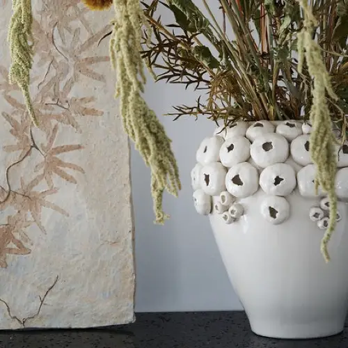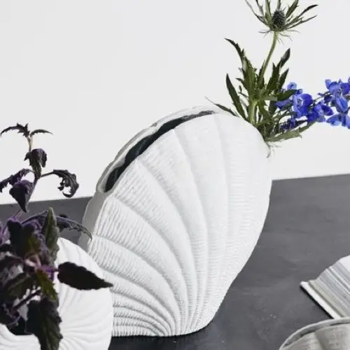 1/ Miroir forme coquillage rétro 2/ Objet déco 3/ Vase 4/ Vase déco couleur terracotta 5/ Corail décoratif 6/ Objet déco 7/ Objet déco méduse fossilisée 8/ Triptyque photos noir et blanc 9/ Vase coquillage blanc 10/ Applique murale coquillage couleur sable 11/ Vase en forme de coquillage blanc 12/ Coquillage décoratif